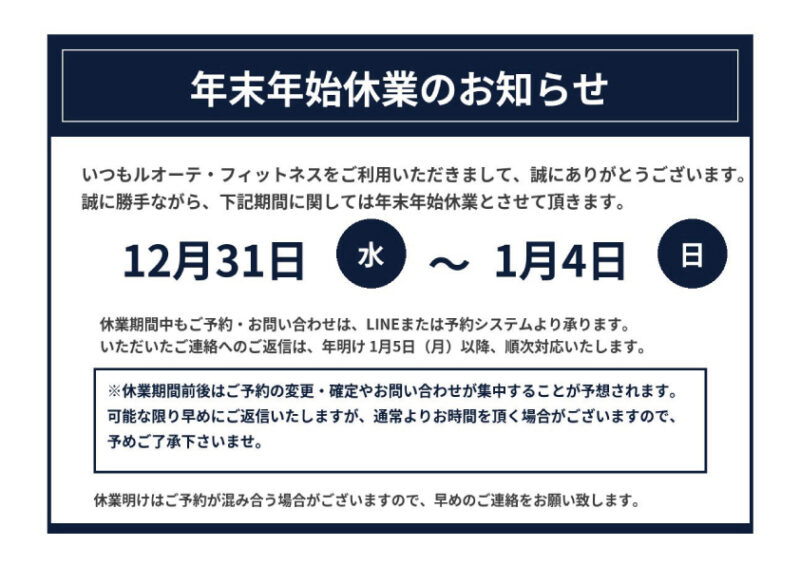 「来年こそ体を変えたい」「運動を始めたい」とお考えの方は、この機会にぜひ一度お問い合わせください。